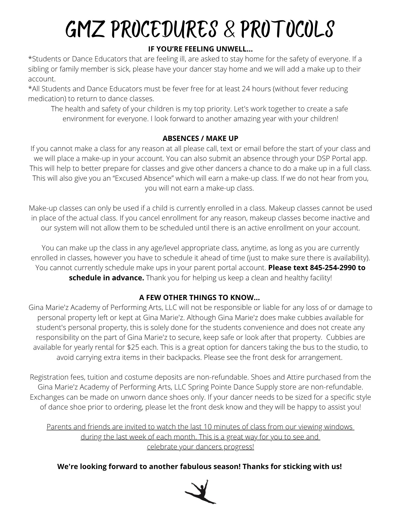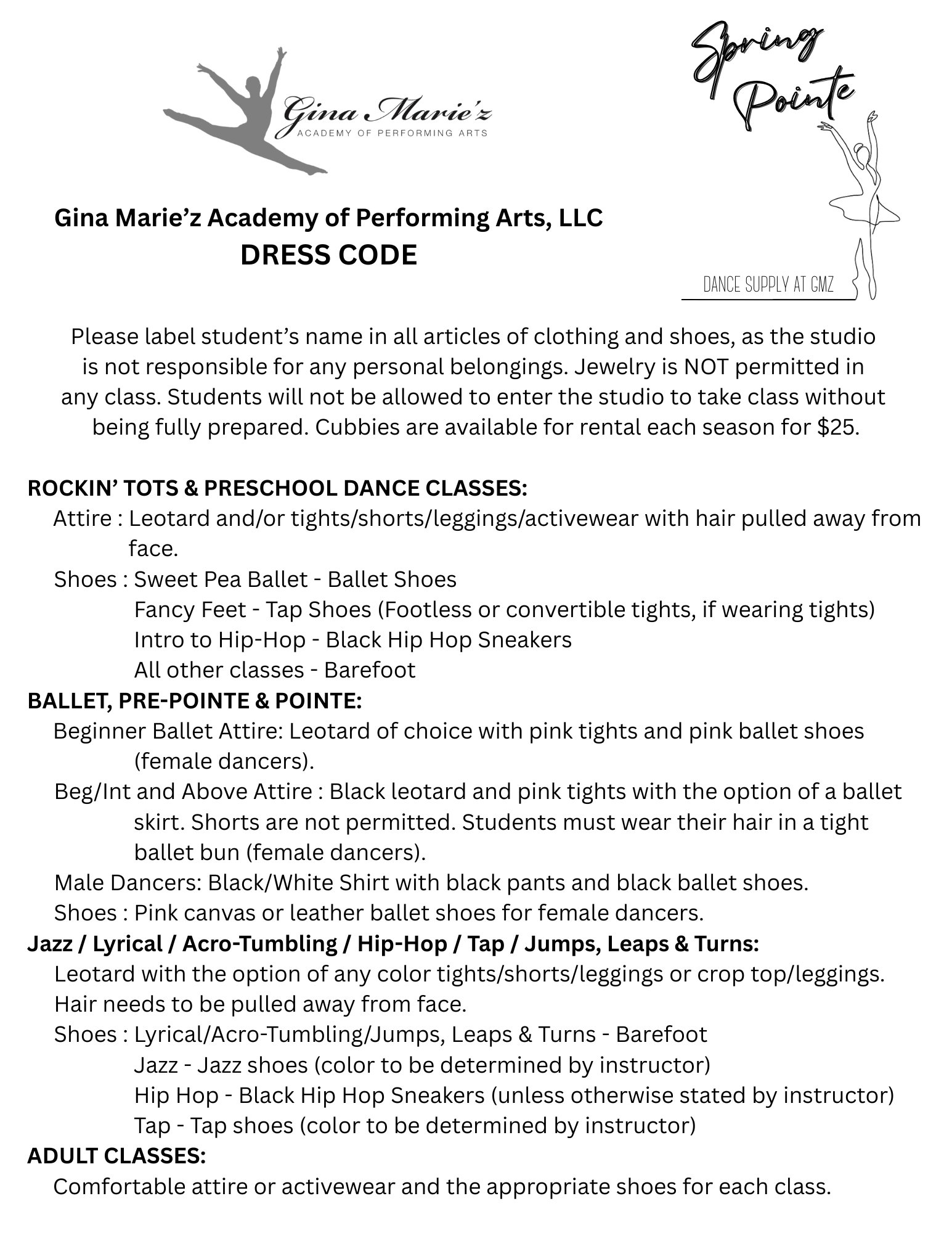Gina believes when dancers look the part, they feel more confident and dance the part! Ensure your dancer is prepared for classes. Visit the Spring Pointe Dance Supply store in the GMZ lobby to order your dancers essentials.