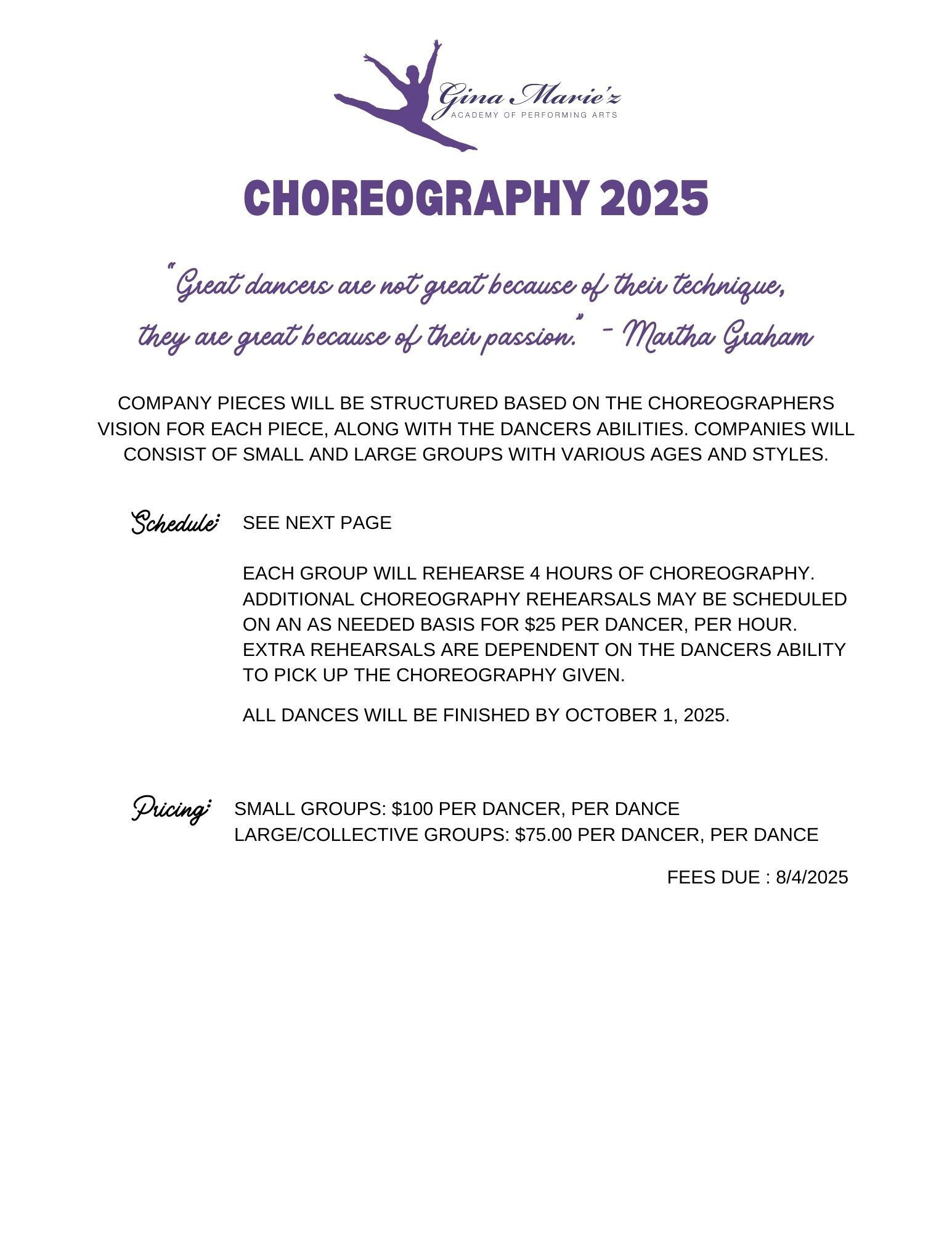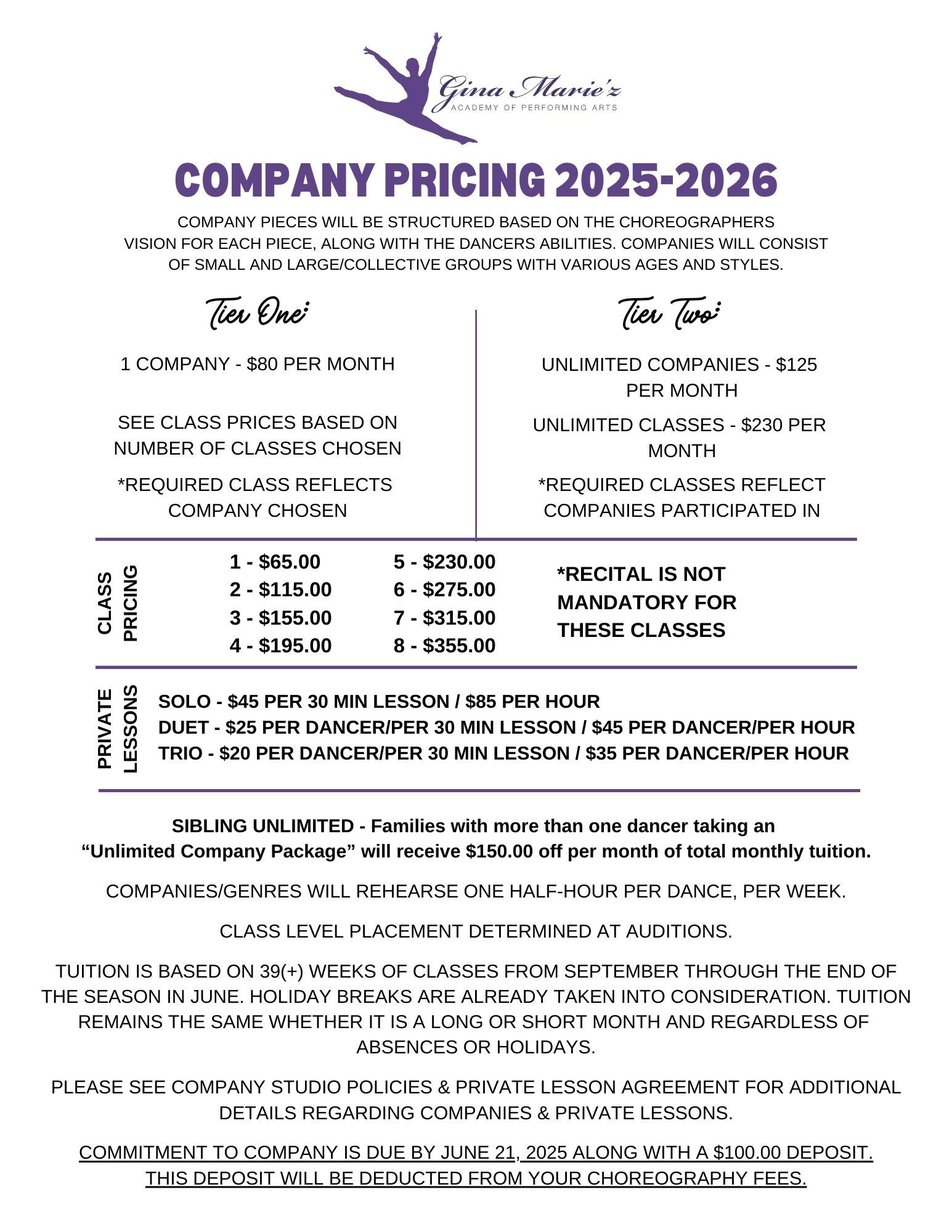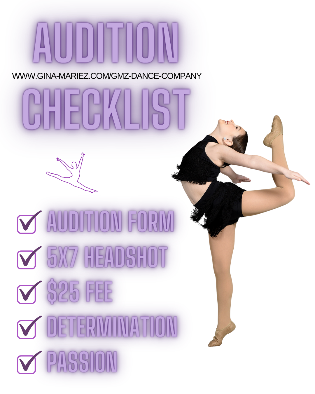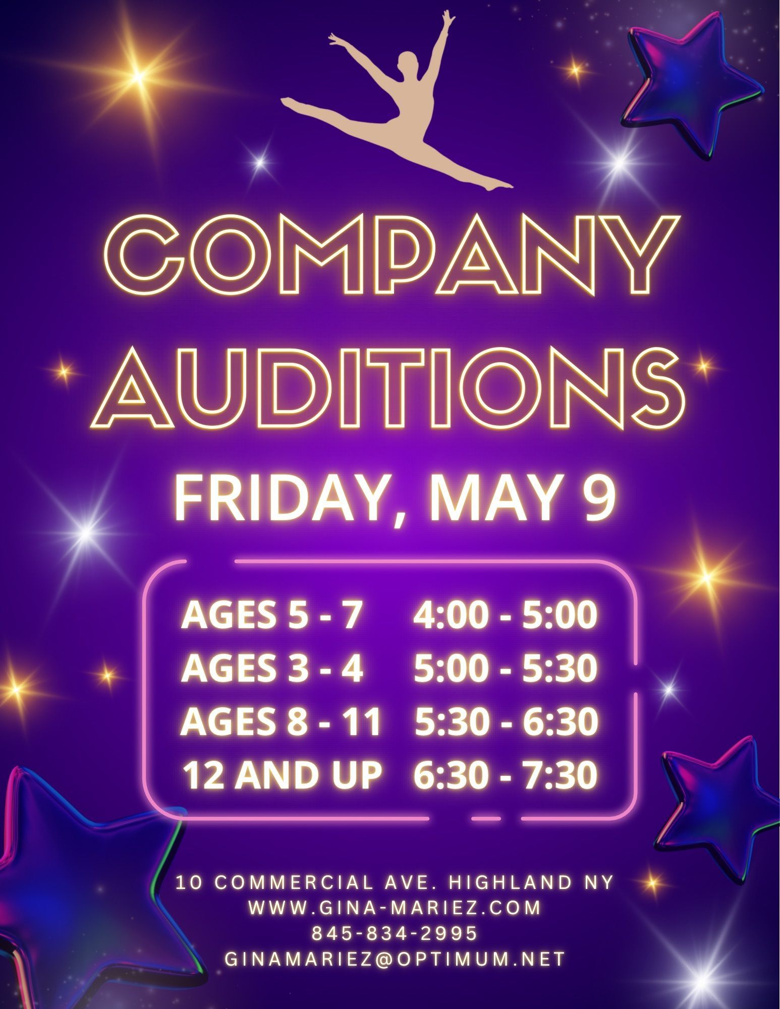 Company placement is by audition only. Company auditions have already been held for our 2025-2026 Season. If you're interested please email ginamariez@optimum.net to schedule an audition. The Audition Newzletter and Registration Form is now available. (If you're having any trouble opening it on a mobile device, please email us for a copy.) If you have any questions, please email ginamariez@optimum.net, call (845) 834-2995 or text (845) 254-2990.